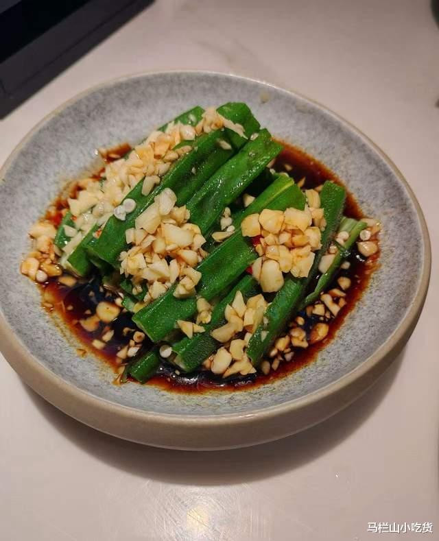 捞汁秋葵:秋葵被白灼后,浇上芥末生抽酱,再放上蒜蓉一起伴着吃,秋葵吃起来脆爽,口感细腻,芥末微微冲鼻,开胃凉菜值得点。