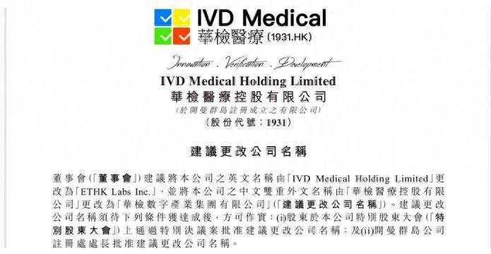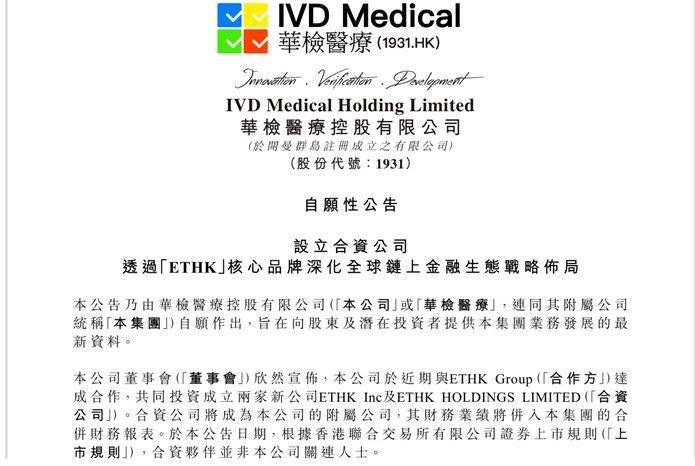 一则是宣布与合作方ETHK Group共同投资成立两家新公司——ETHK Inc.及ETHK HOLDINGS LIMITED,透过「ETHK」核心品牌深化全球链上金融生态战略布局;另一则是建议将公司英文名称由“IVD Medical Holding Limited”更改为“ETHK Labs Inc.”,中文双重外文名称由“华检医疗控股有限公司”更改为“华检数字产业集团有限公司”。